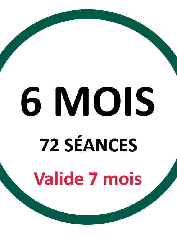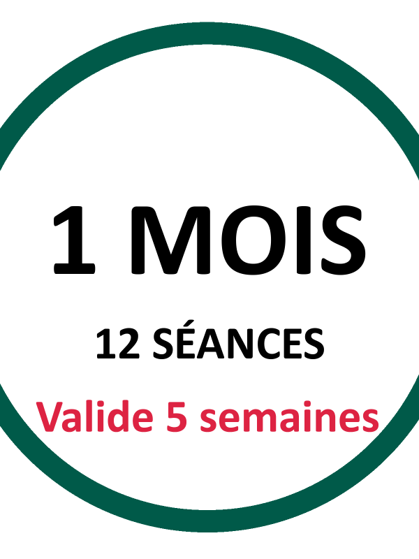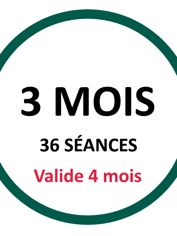 1 Mois (12 Séances) – Valide 5 semaines ,3 Mois (36 Séances) – Valide 4 mois ,6 Mois (72 Séances) – Valide 7 mois |